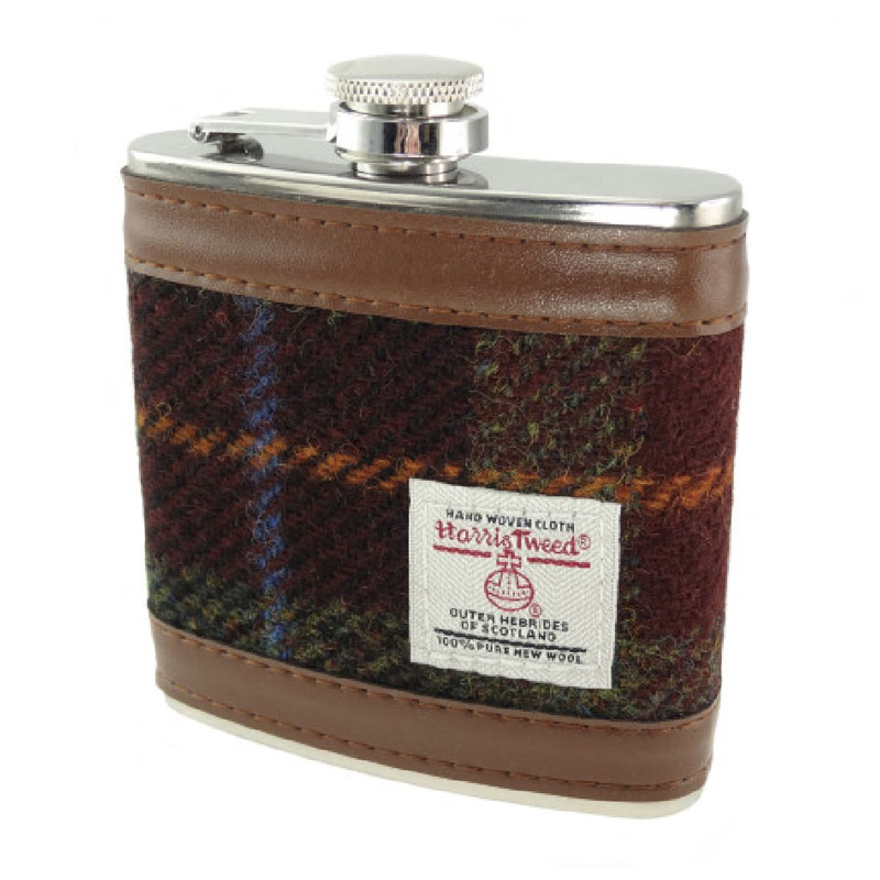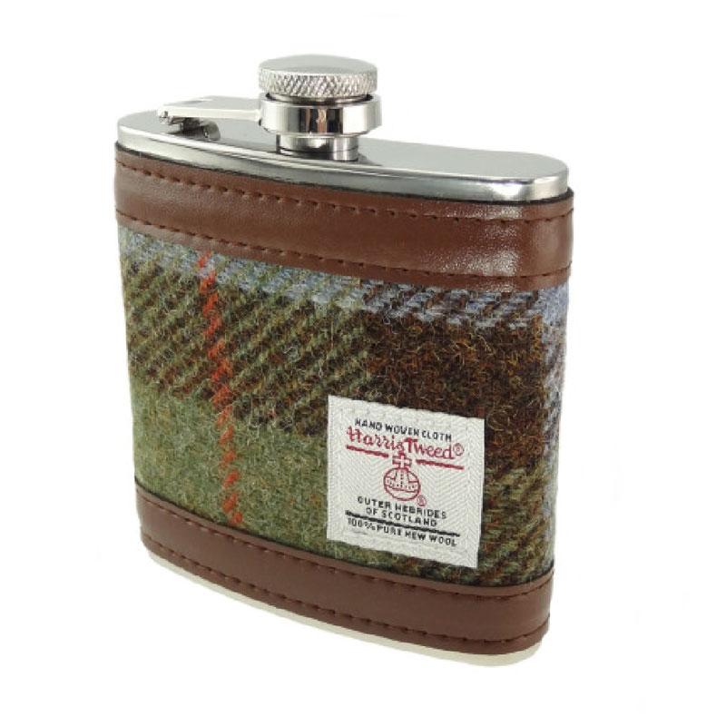 Tragen Sie Ihr Lieblingsgetränk stilvoll mit einem Harris Tweed Flachmann. Diese klassischen Flachmänner sind mit echtem Harris Tweed überzogen und mit luxuriösen Lederakzenten versehen. Kompakt, leicht und ideal für unterwegs – ob beim Wandern, Festival oder einem besonderen Anlass.