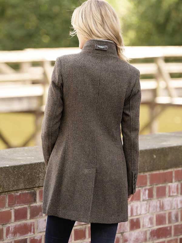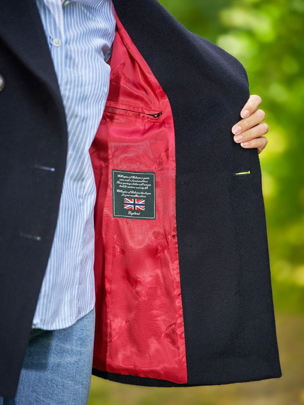Fein gesetzte Teilungsnähte sorgen für eine sanft taillierte Form, die die Figur vorteilhaft betont, ohne auf Bewegungsfreiheit zu verzichten. Hochwertige Echthornknöpfe mit personalisierter Gravur unterstreichen den exklusiven Charakter dieser Jacke. Zwei schräge Leistentaschen außen bieten dezenten Stauraum für kalte Hände oder kleine Essentials, während eine verschließbare Innentasche im glatten Viskosefutter für zusätzlichen Komfort sorgt.