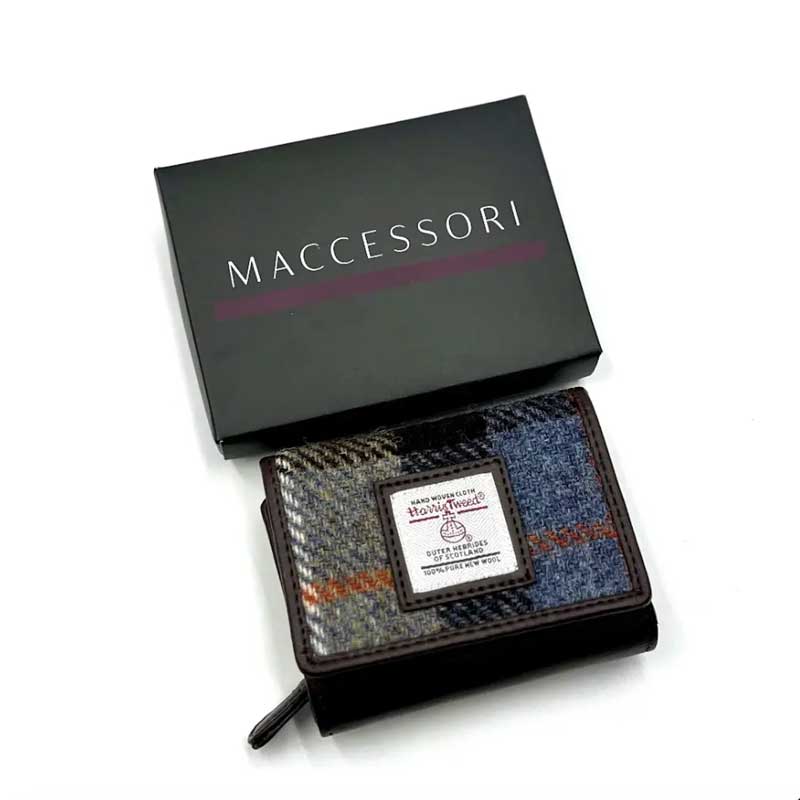 Dreifach gefaltete Handtasche aus Harris Tweed in Blau/Braun kariert.