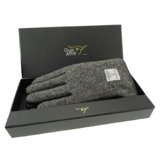 Gents Black Leather & Harris Tweed Gloves Boxed in Heather HB Menge