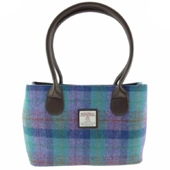 Harris Tweed ‚Cassley‘ Classic Handbag . 100% Wool Harris Tweed outer, Polyester lining and PU trim. 25cm x 38cm x 11cm. Can be worn on the shoulder. Large centre zip pocket with compartments either side with snap clasp closure.