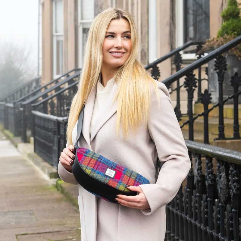Harris Tweed Mini-Umhängetasche in Blau/Rosa Karo.