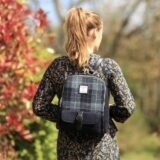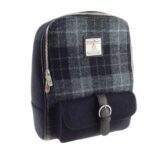 Harris Tweed ‚Naver‘ Backpack with contrasting sides and front pocket. 100% Wool Harris Tweed outer, Polyester lining and PU trim. 33cm x 29cm x 14cm. Large backpack with zip and pocket with magnetic catch. Adjustable straps.