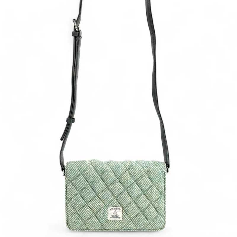 Harris Tweed Stepp-Schultertasche in Türkis-Fischgrätmuster.