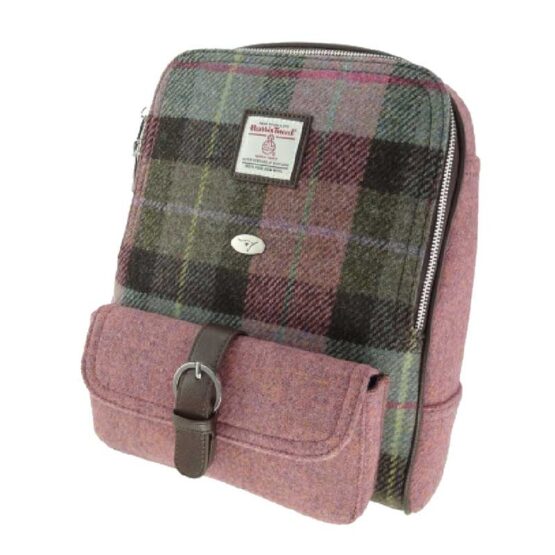 Harris Tweed ‚Naver‘ Backpack with contrasting sides and front pocket. 100% Wool Harris Tweed outer, Polyester lining and PU trim. 33cm x 29cm x 14cm. Large backpack with zip and pocket with magnetic catch. Adjustable straps.