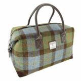 Harris Tweed ‚Esk‘ Overnight Bag. 100% Wool Harris Tweed outer, Polyester lining and PU trim. 25cm x 45cm x 22cm. Suede corners, zip and adjustable buckles to enlarge opening.
